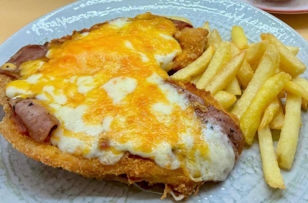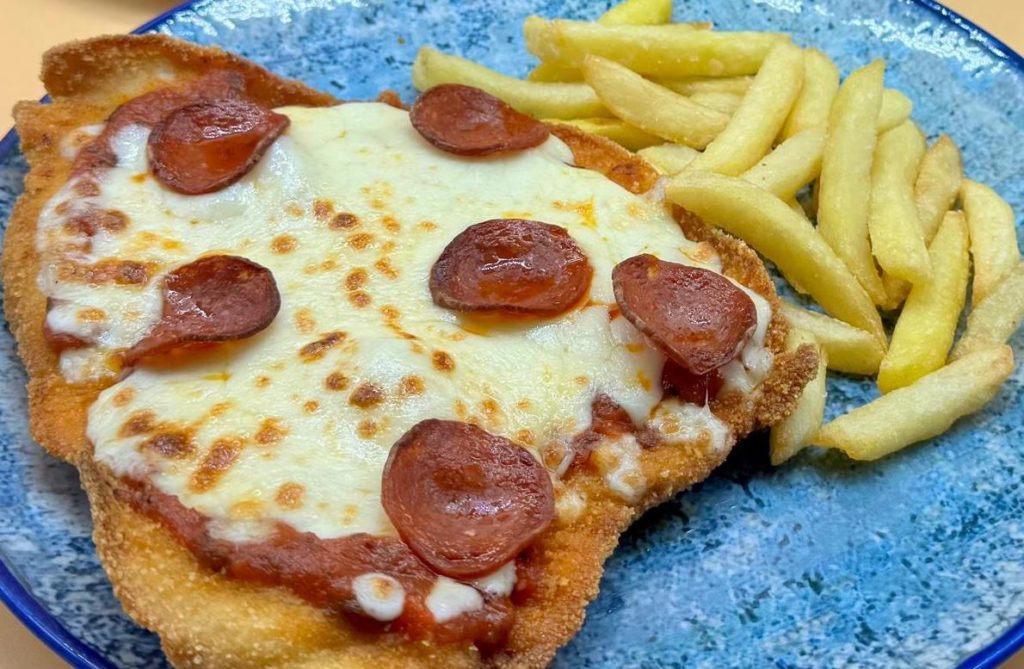 Filete de pechuga de pollo empanado, salsa de tomate, mozzarella gratinado y taquitos de jamon serrano con un toque de aceite de oliva virgen.